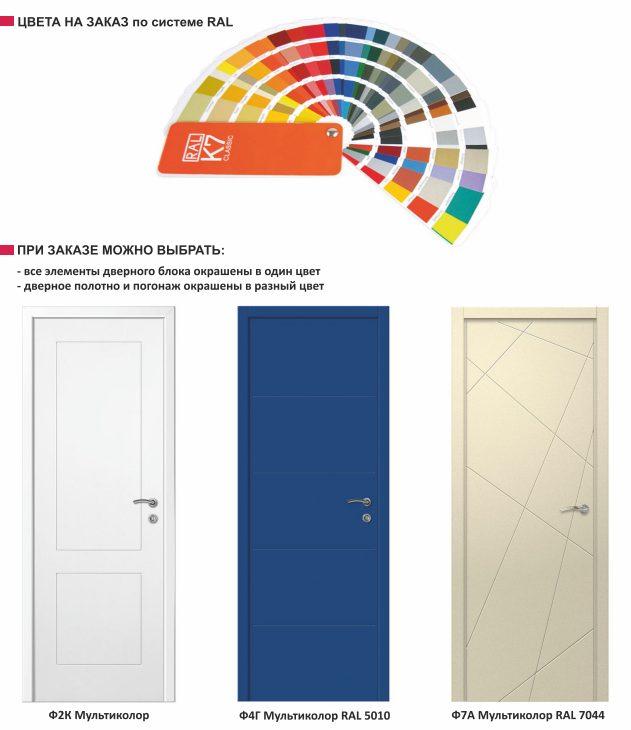KAPELLI multicolor — это влагостойкие двери серии KAPELLI classic (гладкие и с фрезерованной филенкой), которые окрашены специальной краской производства Италии и Германии для ПВХ по системе RAL.